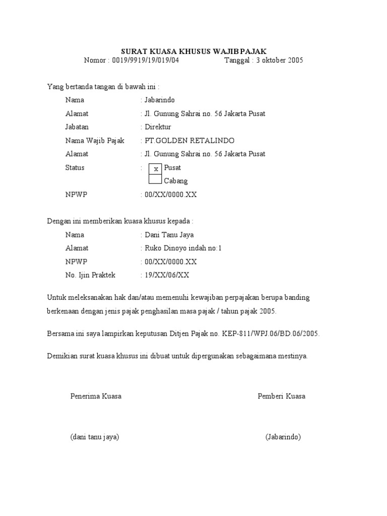 Diisi dengan BADAN dalam hal pemberi kuasa adalah Wajib Pajak badan atau ORANG PRIBADI dalam hal pemberi kuasa adalah Wajib Pajak orang pribadi. Selain contoh surat di atas ada pula contoh surat kuasa pajak lain dengan format yang serupa seperti di bawah ini. JlSuko Manunggal Desa Banyuasin Kalitengah Sidoarjo Jabatan. Surat kuasa harus menyebutkan hak dankewajiban pajak yang dikuasakan. Diisi dengan BADAN dalam hal pemberi kuasa adalah Wajib Pajak badan atau ORANG PRIBADI dalam hal pemberi kuasa adalah Wajib Pajak orang pribadi. Kuasa Wajib Pajak hanya menjalankan hal-hal yang dikuasakan saja.